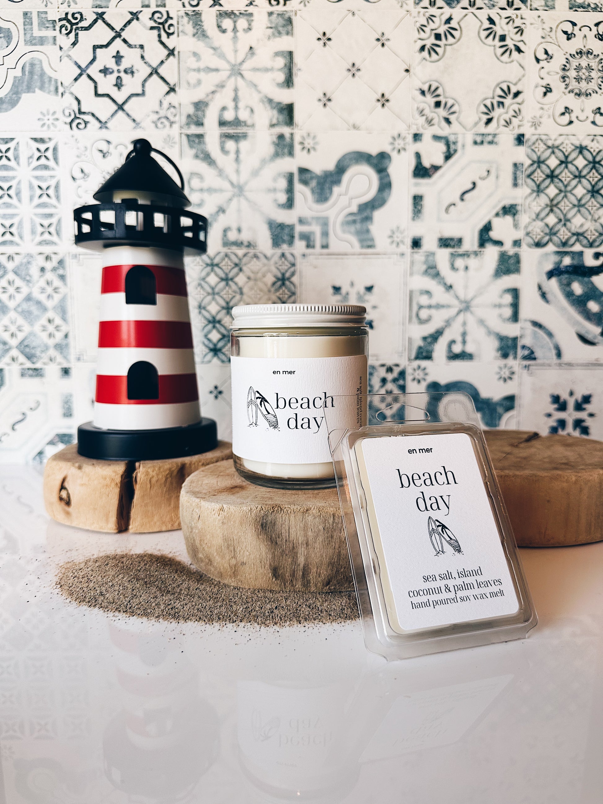 you know how it smells to lay on the beach in the sunshine? yeah, that’s this soy wax candle & wax melts. “beach day” is warm, salty, citrusy and coconutty with a slightly reminiscent hint of a scented sun tan lotion.