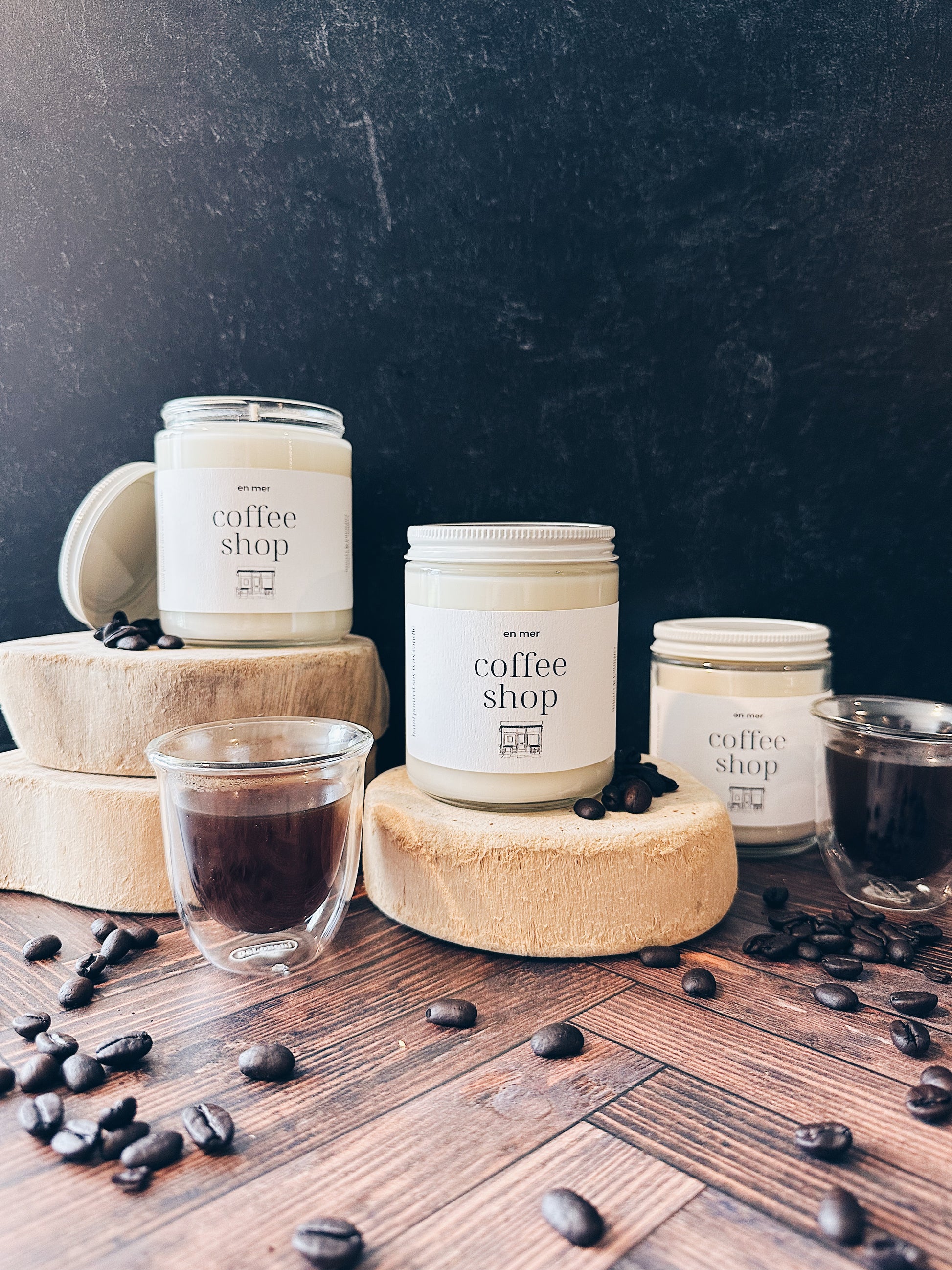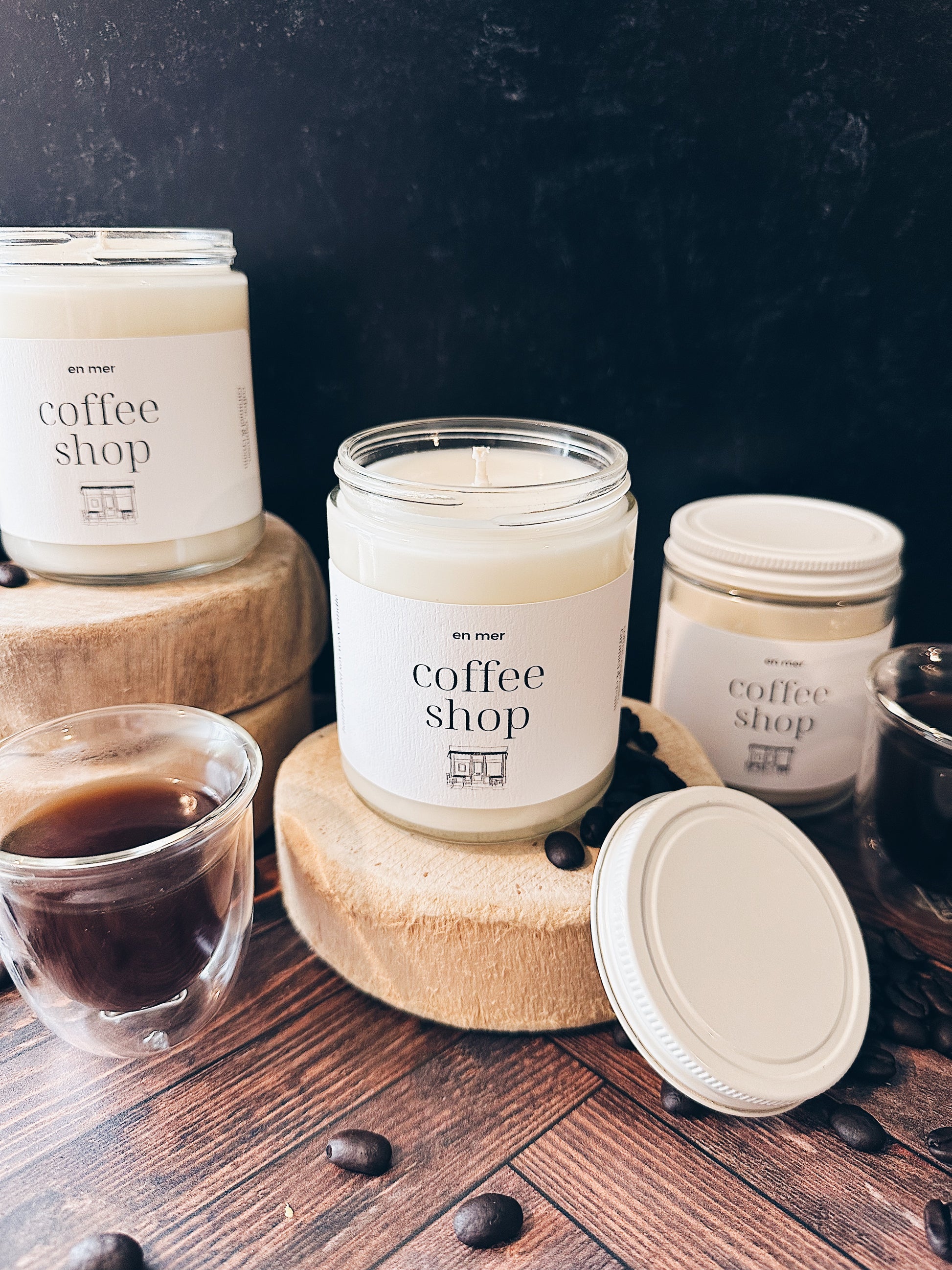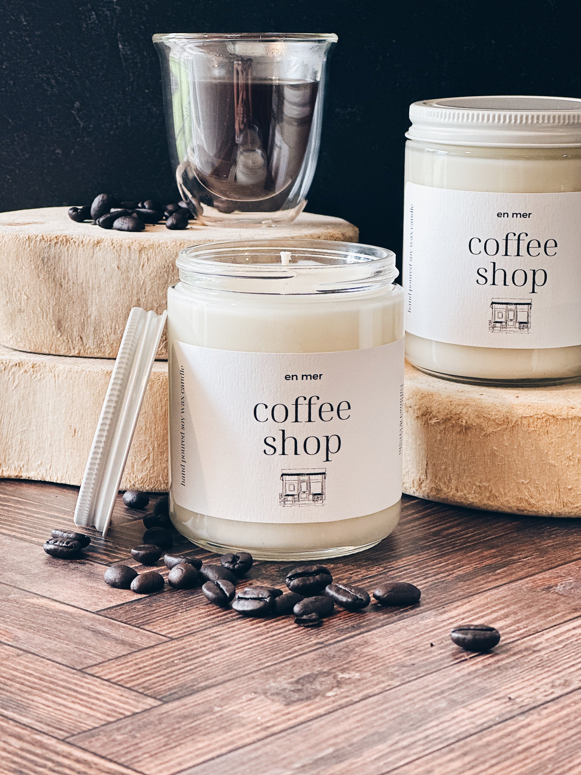 "coffee shop" captures that amazing aroma of....a coffee shop, obviously. complex notes of coffee, espresso, chocolate, leather, tea leaves and more swirl together in this amazing soy wax candle. also one of the largest candles we offer, for only true coffee lovers!