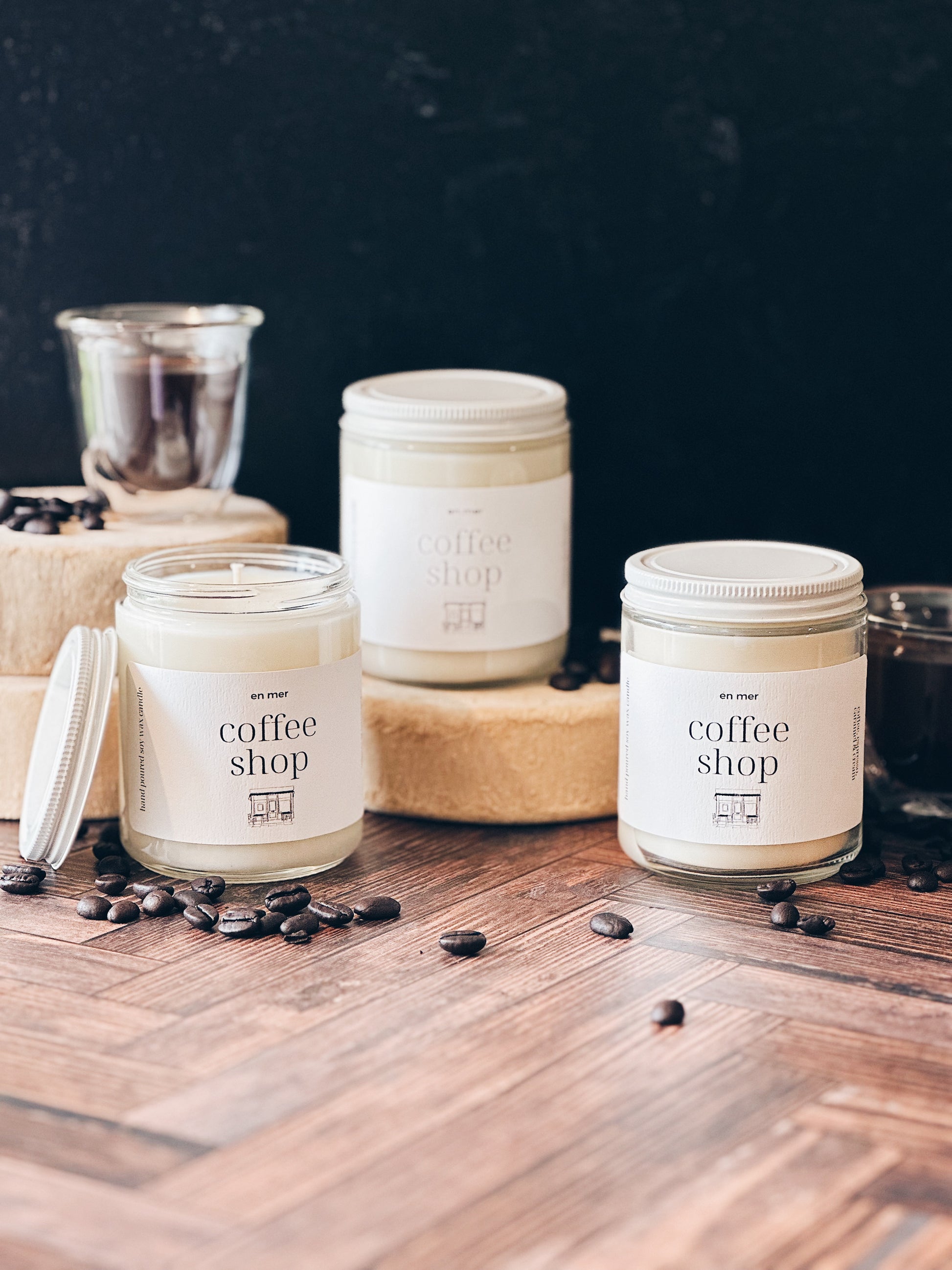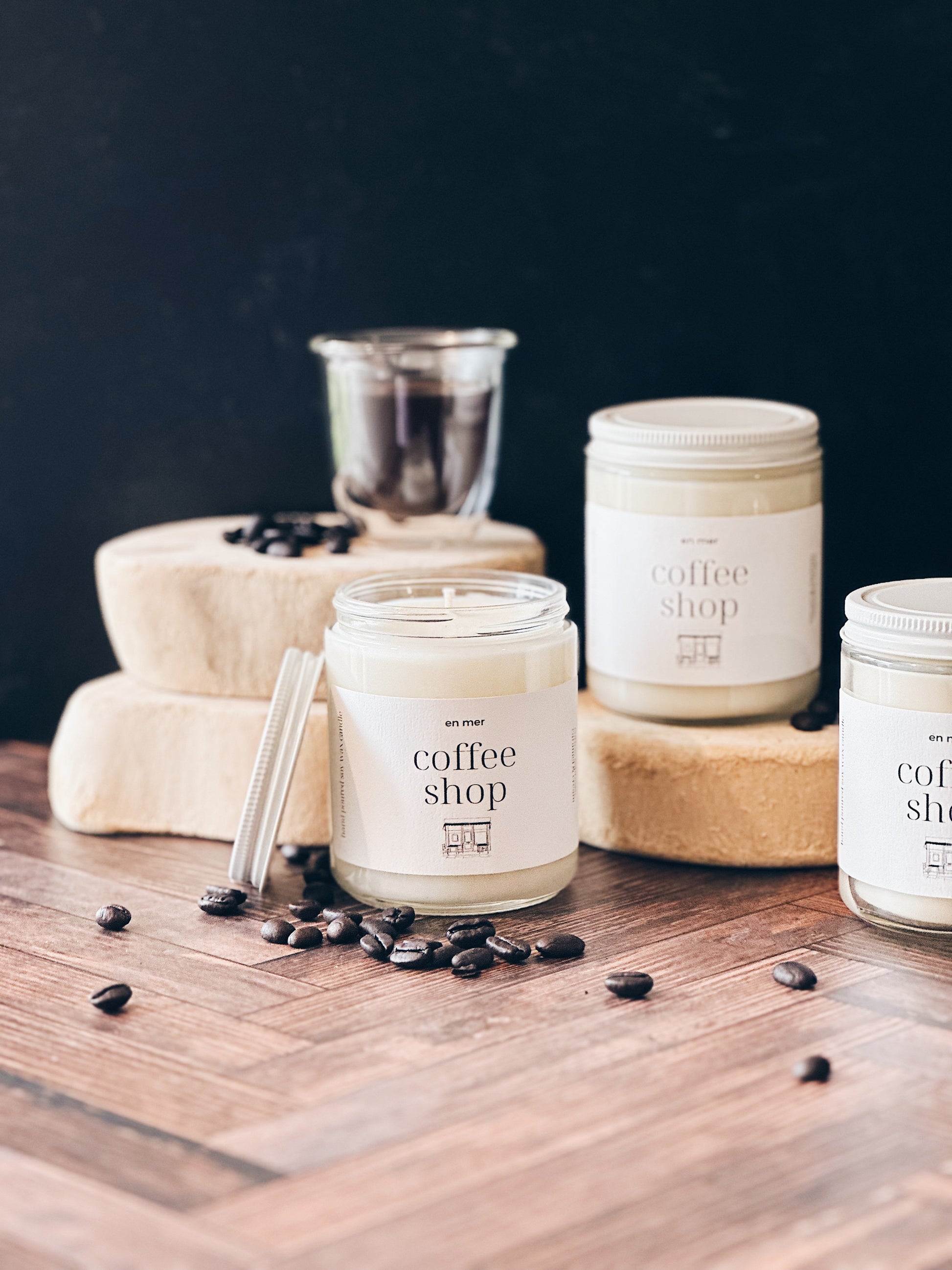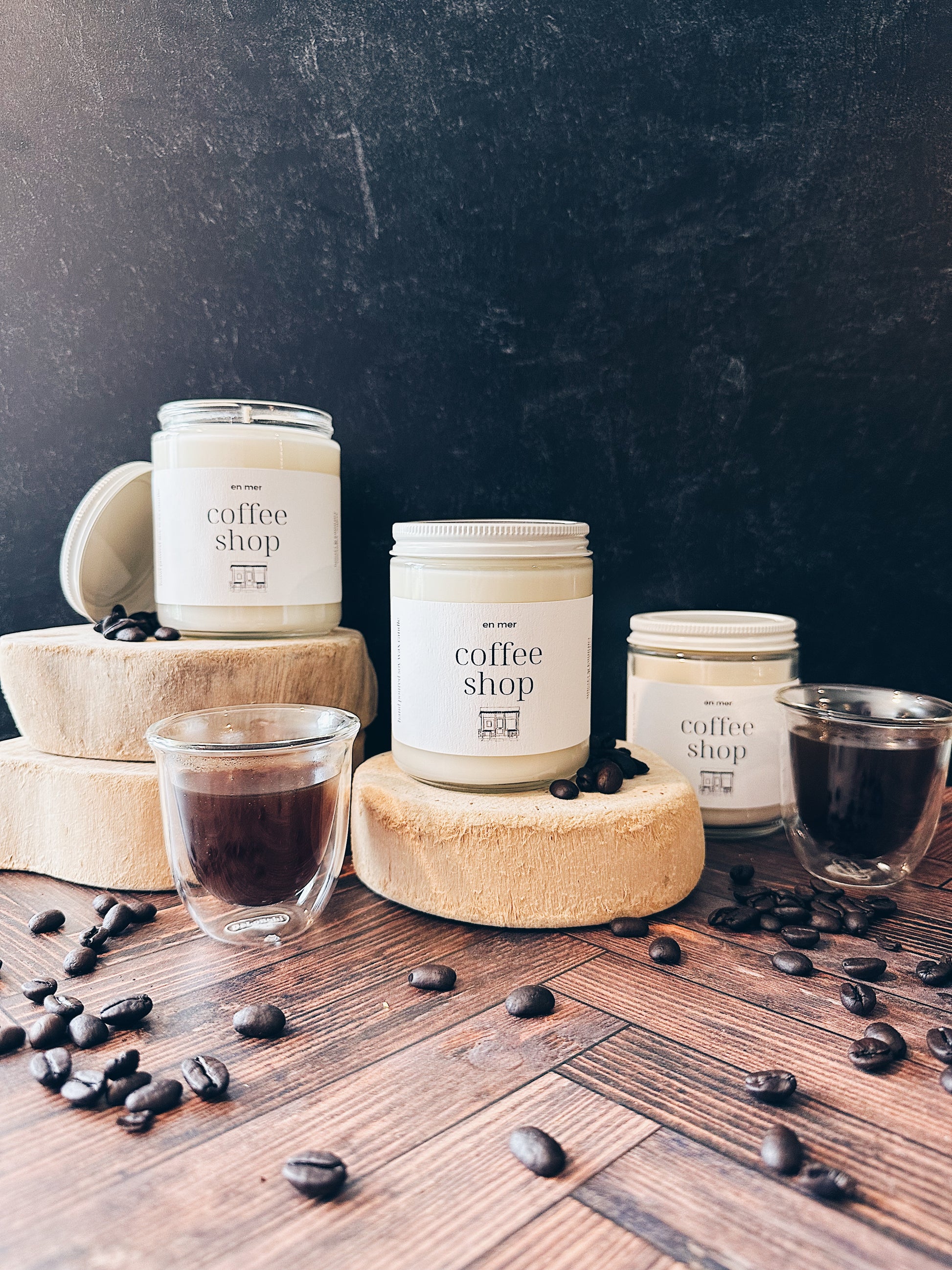 "coffee shop" captures that amazing aroma of....a coffee shop, obviously. complex notes of coffee, espresso, chocolate, leather, tea leaves and more swirl together in this amazing soy wax candle. also one of the largest candles we offer, for only true coffee lovers!