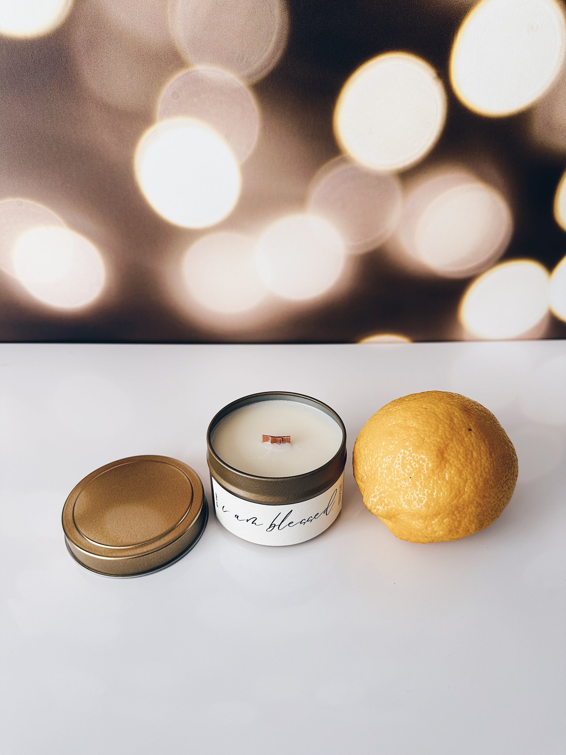 from the affirmation collection comes the "i am blessed" candle. in a beautiful gold tin, this soy wax candle makes the perfect gift or self-gift as a reminder of the many blessings we all have. available in our "be the light" scent of white tea & lemon.