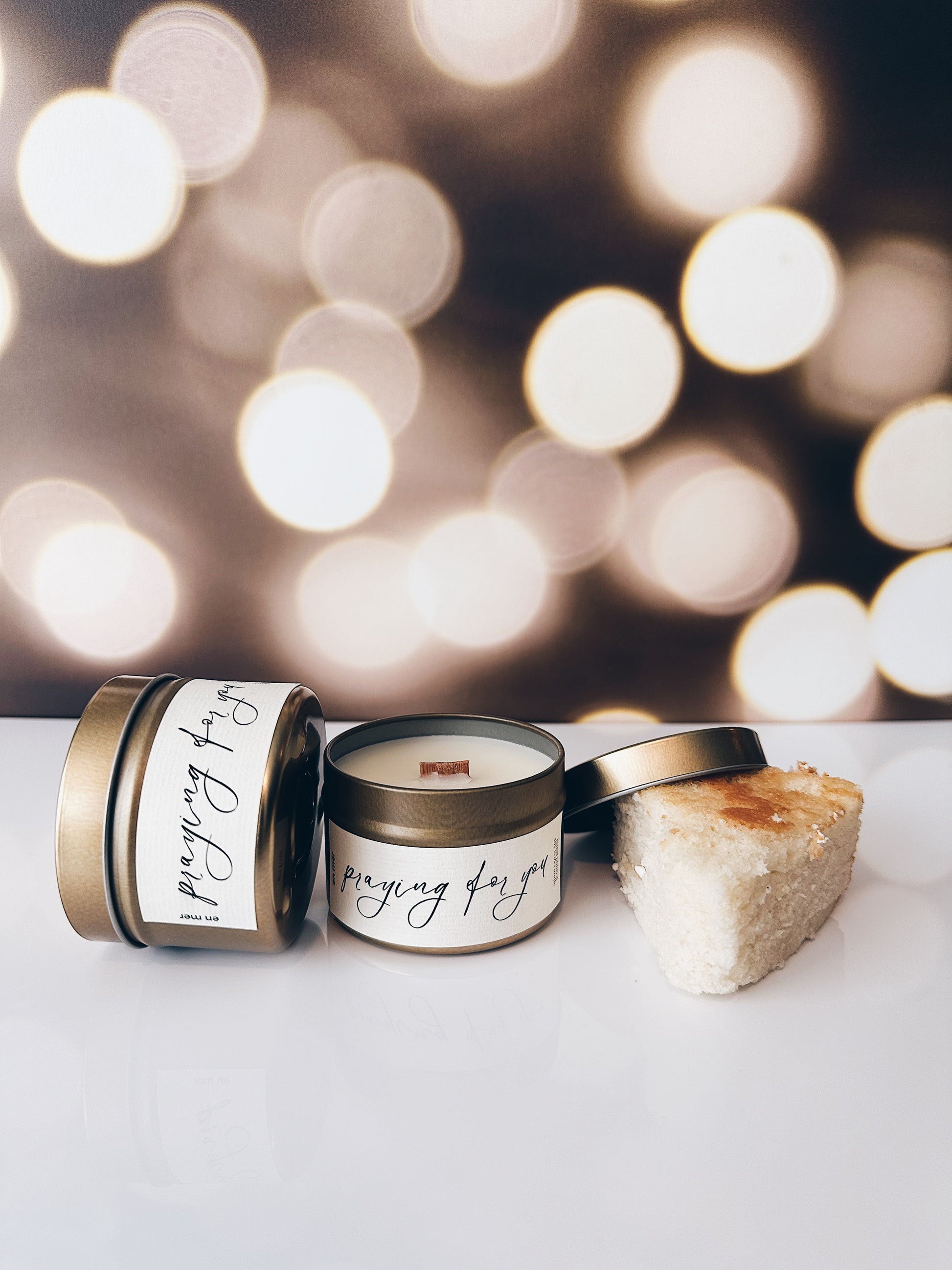 from the affirmation collection comes the "praying for you" candle. in a beautiful gold tin, this soy wax candle makes the perfect gift for those that need a little uplifting or encouragement. available in our classic vanilla scent.