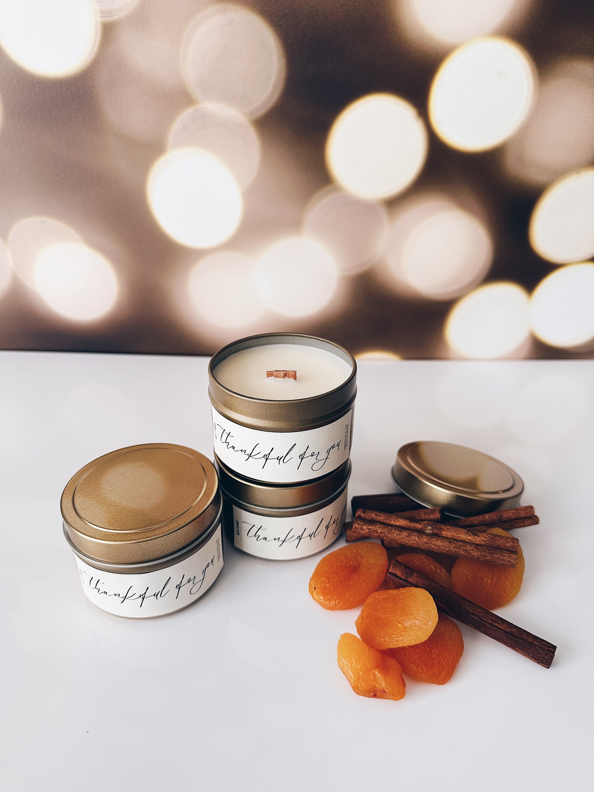 from the affirmation collection comes the "thankful for you" candle. in a beautiful gold tin, this soy wax candle is the perfect reminder to your loved ones of how thankful you are for them in your life. in our "velvet gold" scent.