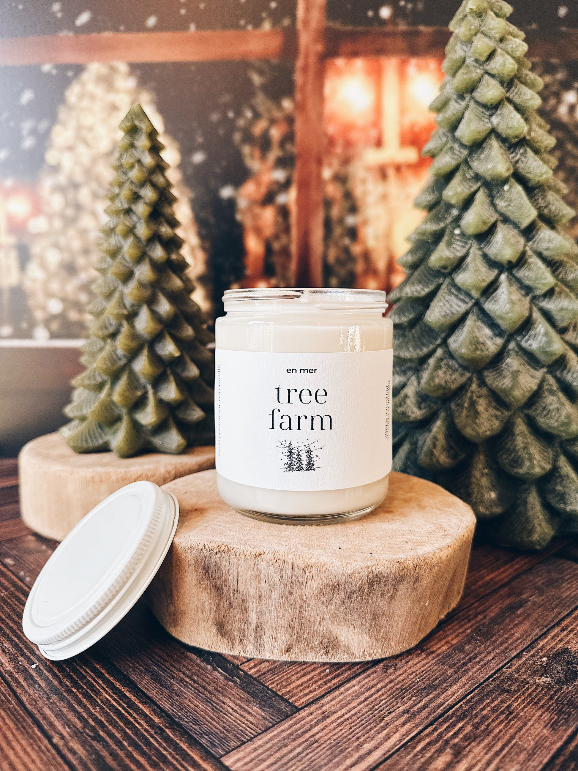 welcome to the en mer tree farm where the aromas are evergreen! light up this soy wax candle or melts - and it’s a scented stroll through the forest with notes of balsam, evergreen, bergamot, and pine.