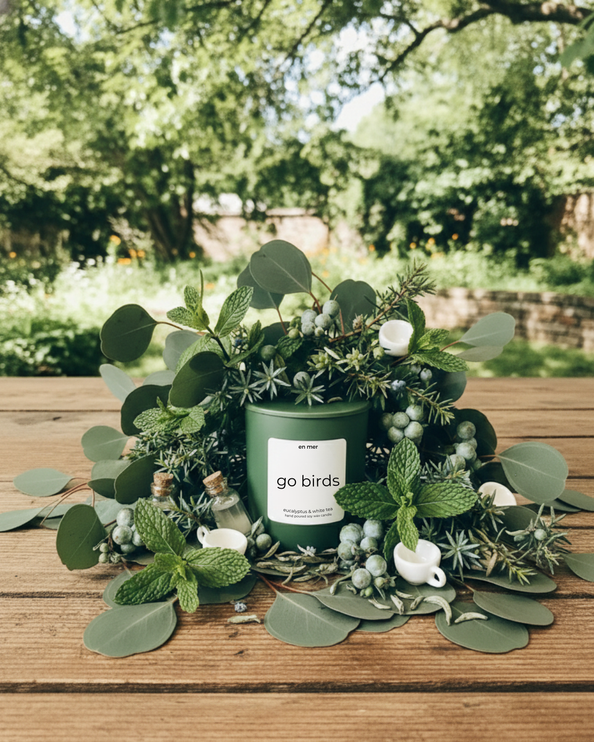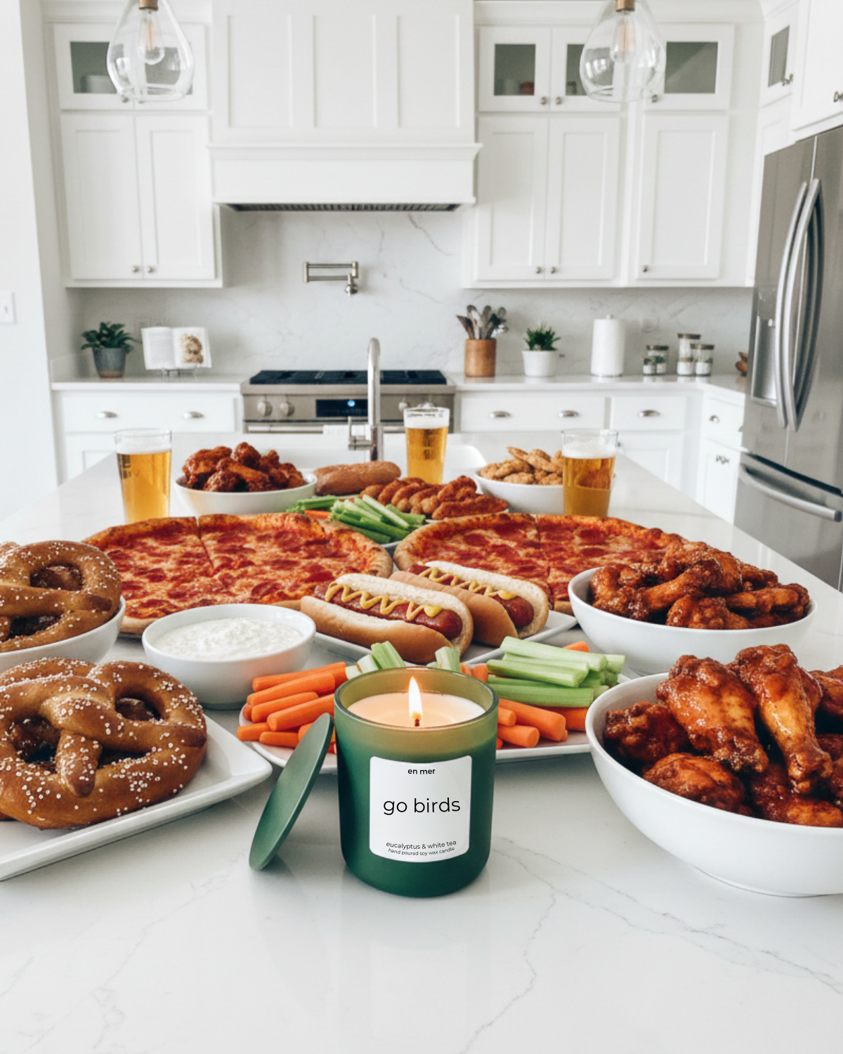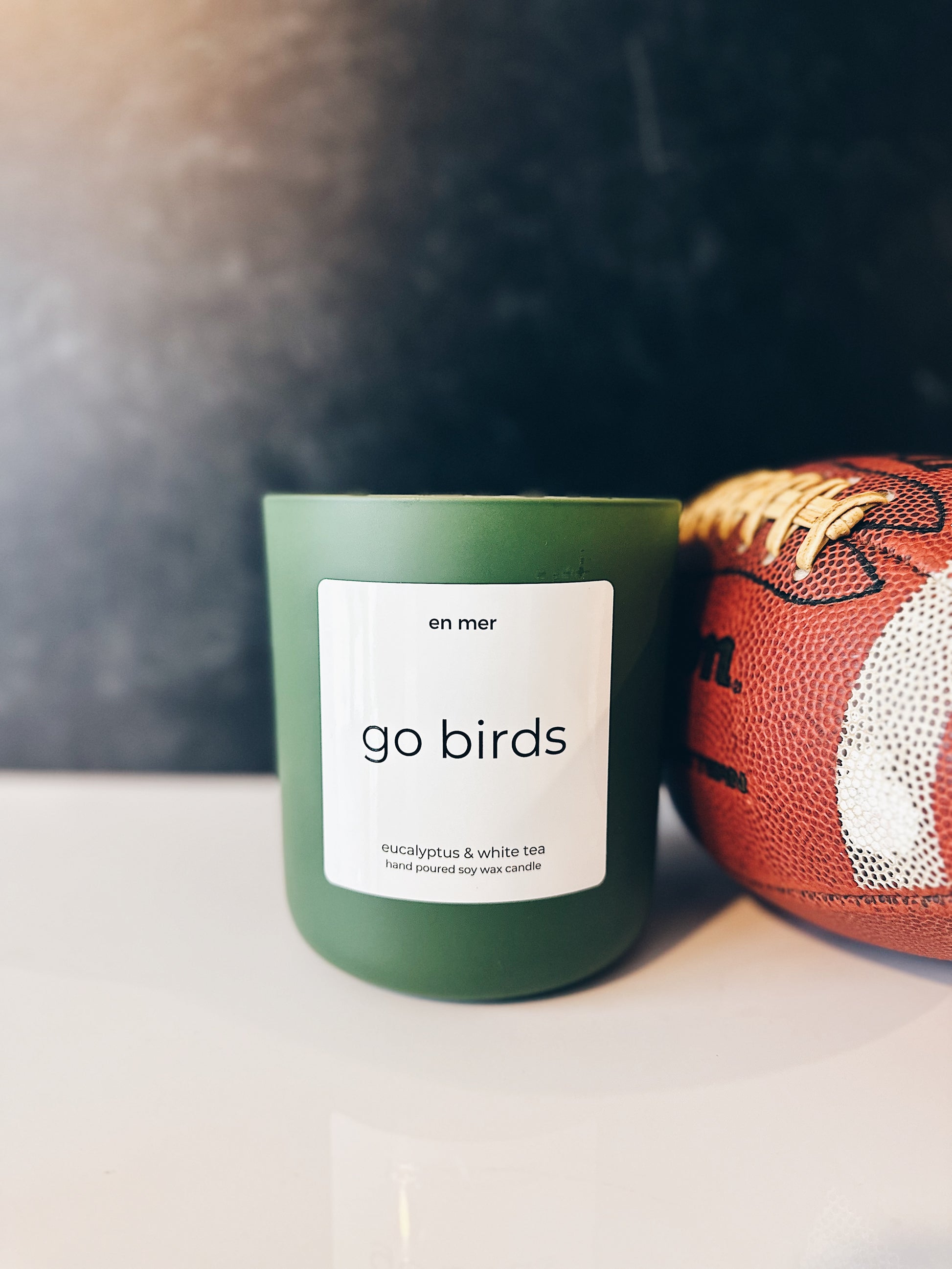 show your philly pride with this "go birds" soy wax candle! a refreshing & clean blend of eucalyptus & white tea is perfect for all year, but especially great after celebrating a win. available in a matte green glass jar. our classic size is 8oz while the MEGA is 24oz (for real fans only).