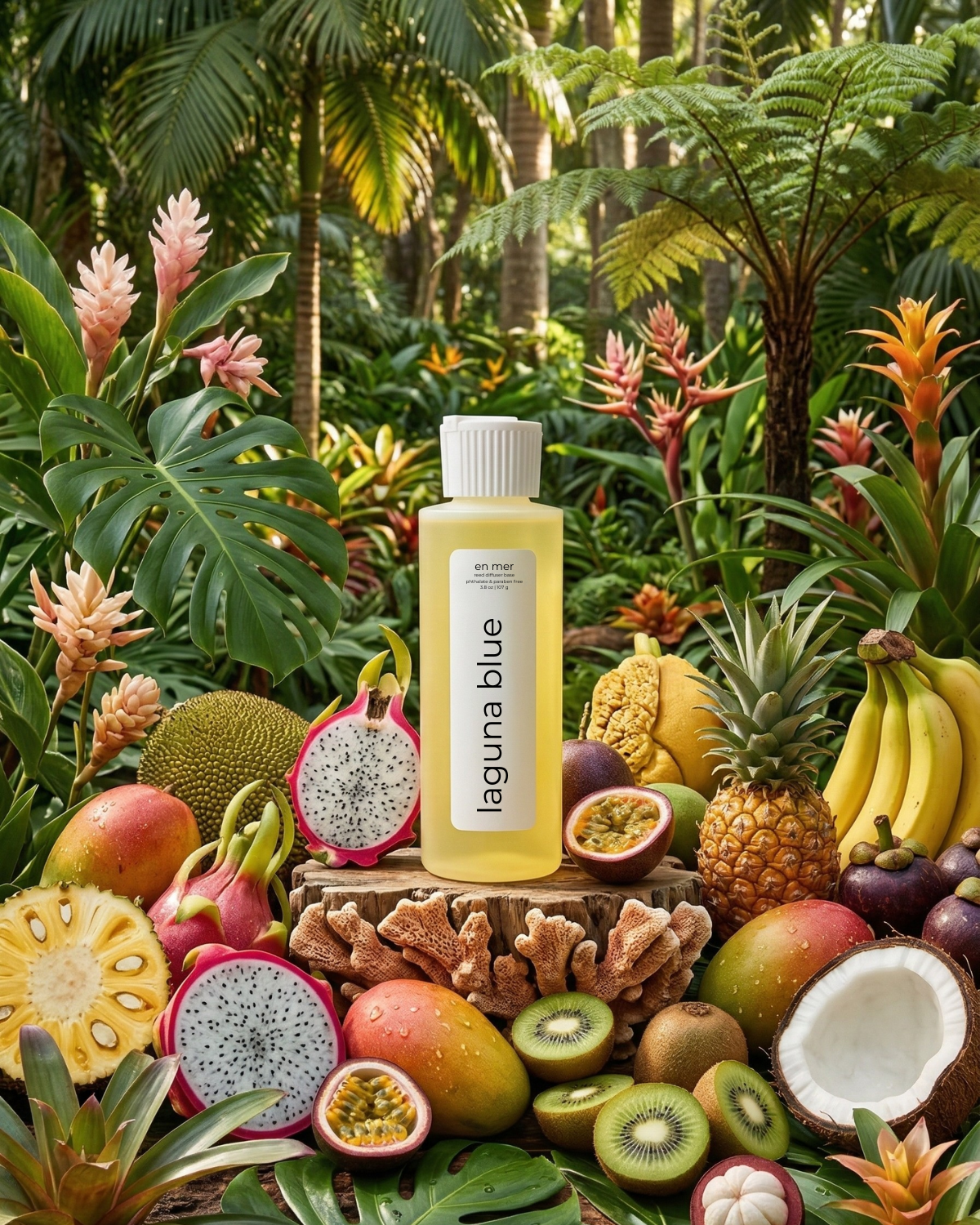 one of our absolute favorites - the laguna blue reed diffuser base is like a tropical destination right in your living room. it's fruity fresh with crisp watery accents and sparkles of tropical foliage on top of citrus.