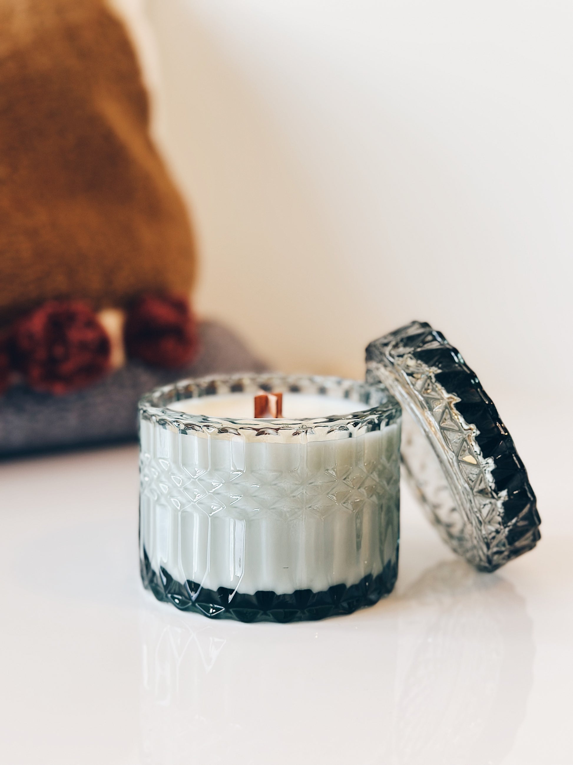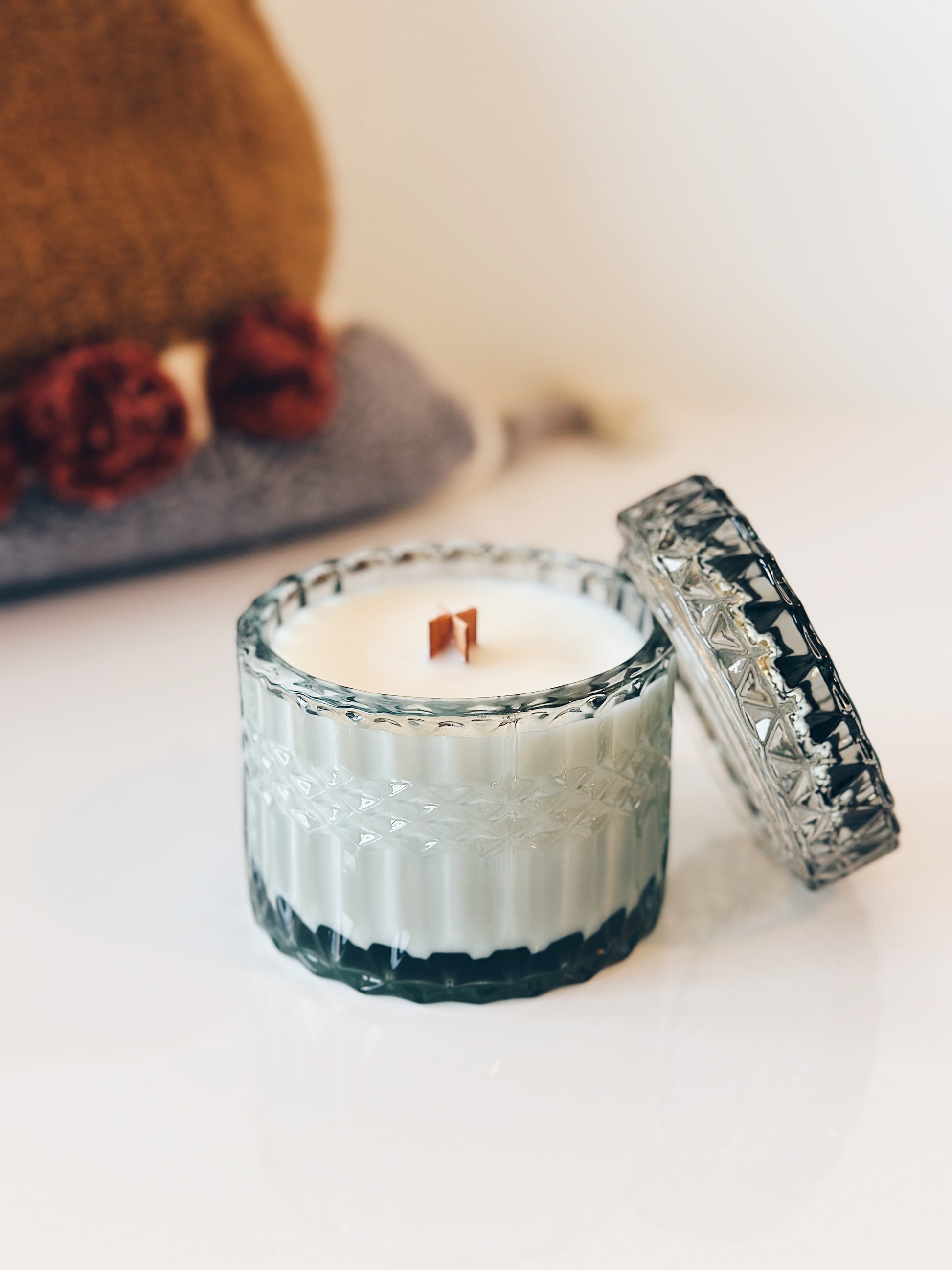 the en mer LTD version of this beloved soy wax candle comes in a super-high quality, light blue, crystal glass jar and lid. the ultimate piece of décor to elevate any home with a light crackling wood wick. the x-shaped design helps create an even burn and easy light!