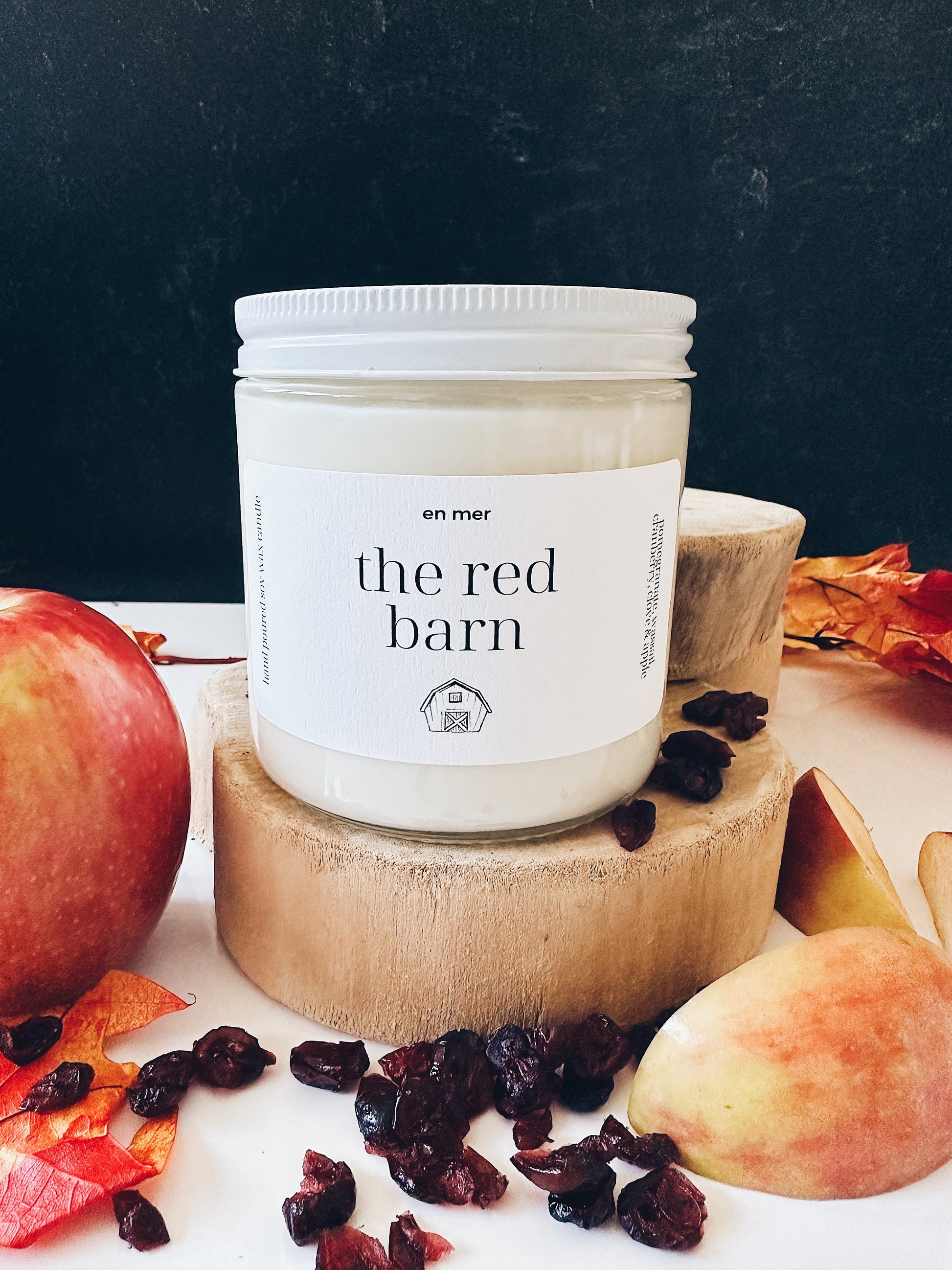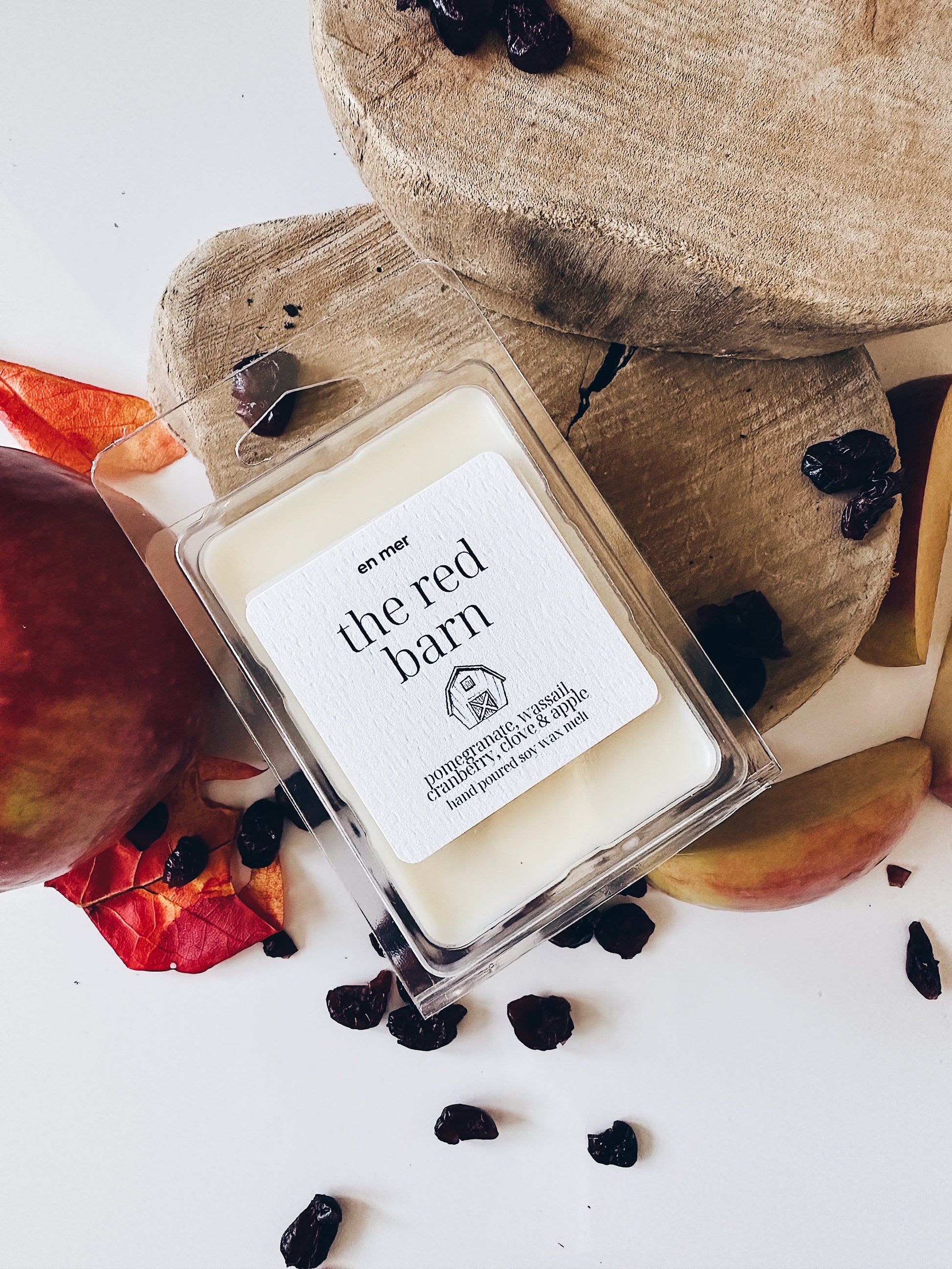 the red barn soy wax candle & wax melts came from an idea of creating a candle that smelled like a color. yes, you heard that right. the scent on this one is red-diculous! enjoy a blend of pomegranate, wassail, cranberry, clove and apple and bask in a cozy, red barn-inspired atmosphere!